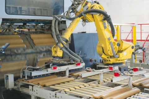 Debido a su contenido de agua de mezclado, así como a su forma y tamaño, las tejas planas también están expuestas al riesgo de deformarse durante la carga y descarga de la prensa de tejas. Por lo tanto, los robots y las pinzas para cargar y descargar las prensas de tejas también deben diseñarse con mucha sensibilidad.